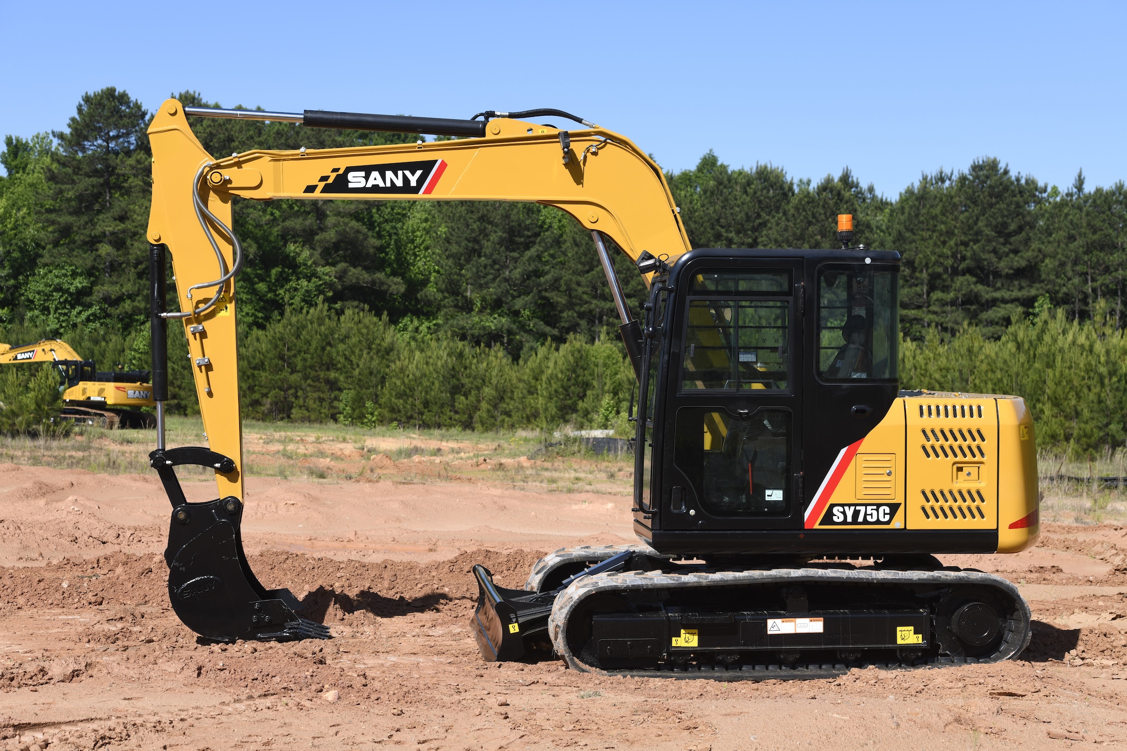 The SY75C compact excavator is built tough with a reinforced boom, arm, swing platform, and undercarriage, powered by a reliable Yanmar T4F engine. Its joystick controls and bi-directional auxiliary hydraulic system deliver versatile performance in a compact design. The cab features heating and AC for operator comfort, while ground-level access to service points ensures fast maintenance and minimal downtime.