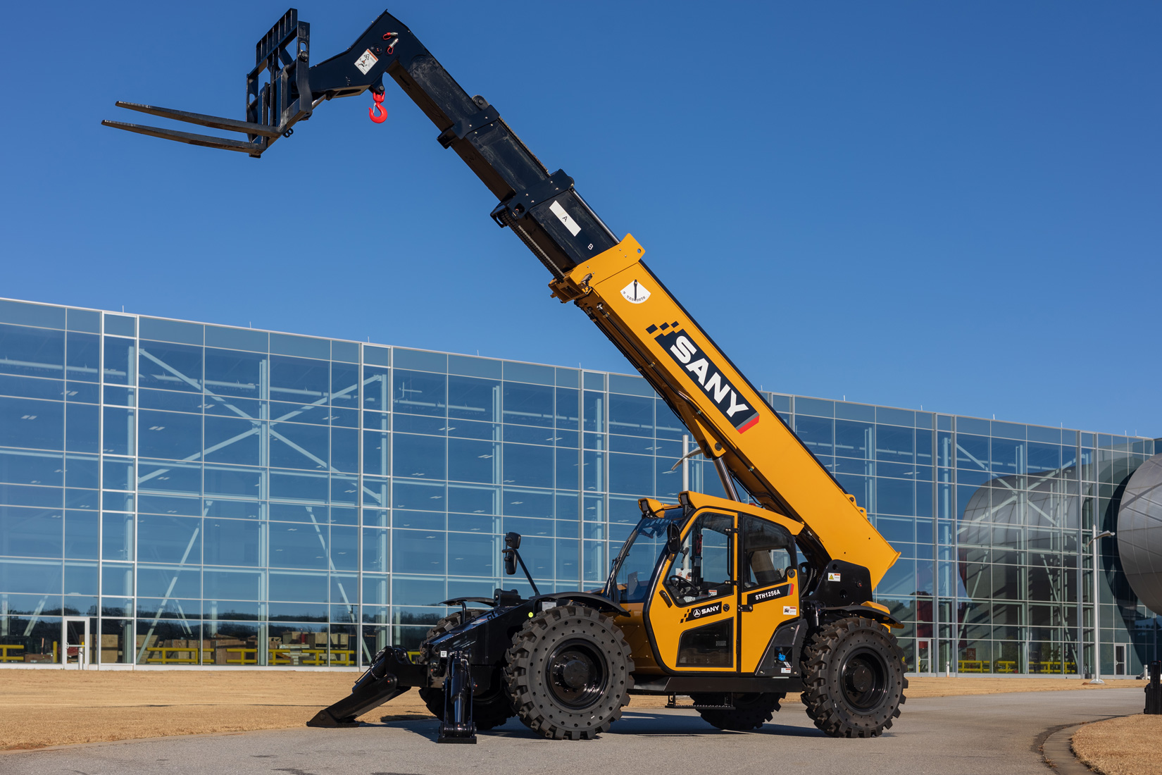 The SANY STH1256A telehandler is built for the toughest jobs, tested for durability with over 10,000 laps on rough terrain and 20,000 lift cycles at full load. Operators enjoy excellent visibility of all four tires and clear rear views, while standard features like a wide-angle rearview camera, reverse sensing system, LED work lights, flashing beacon, and lift hook enhance safety and efficiency. With optional open or enclosed cabs and a variety of fork carriages and attachments, the STH1256A can be configured to meet the demands of any job site.
